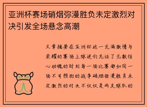 亚洲杯赛场硝烟弥漫胜负未定激烈对决引发全场悬念高潮